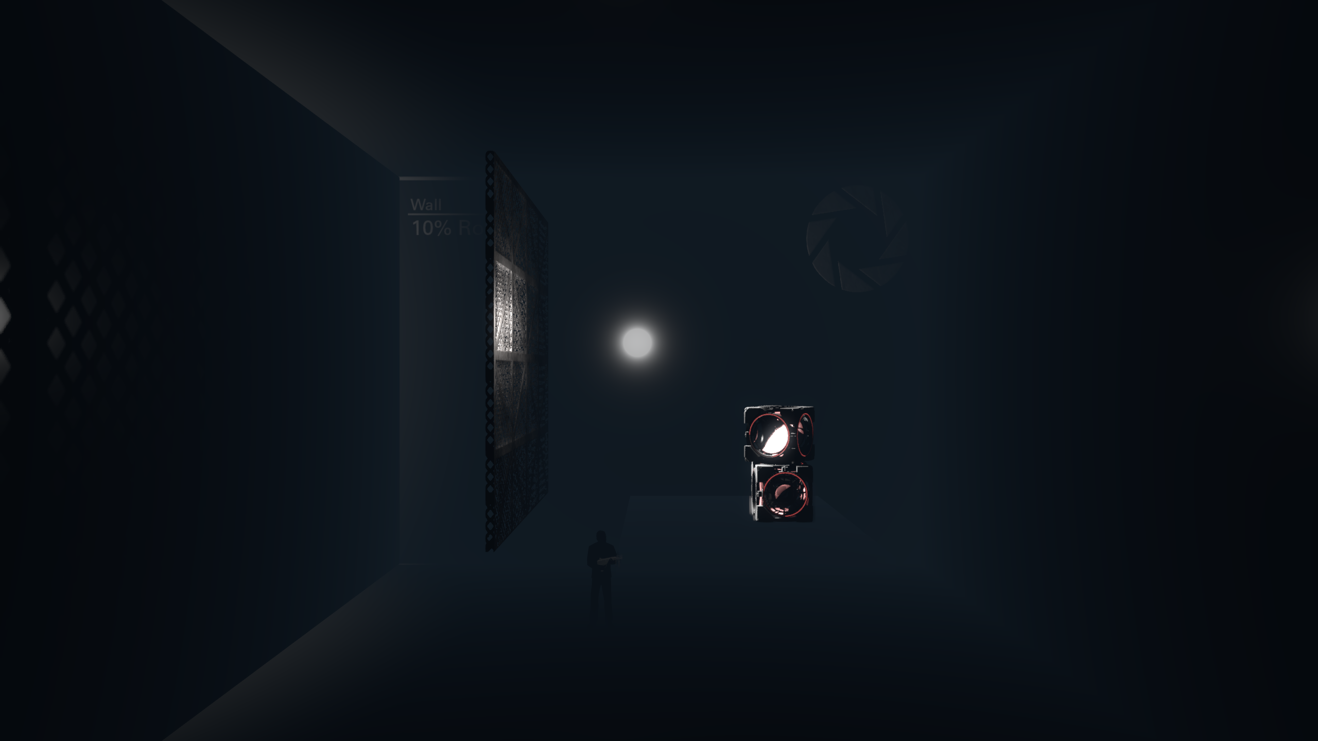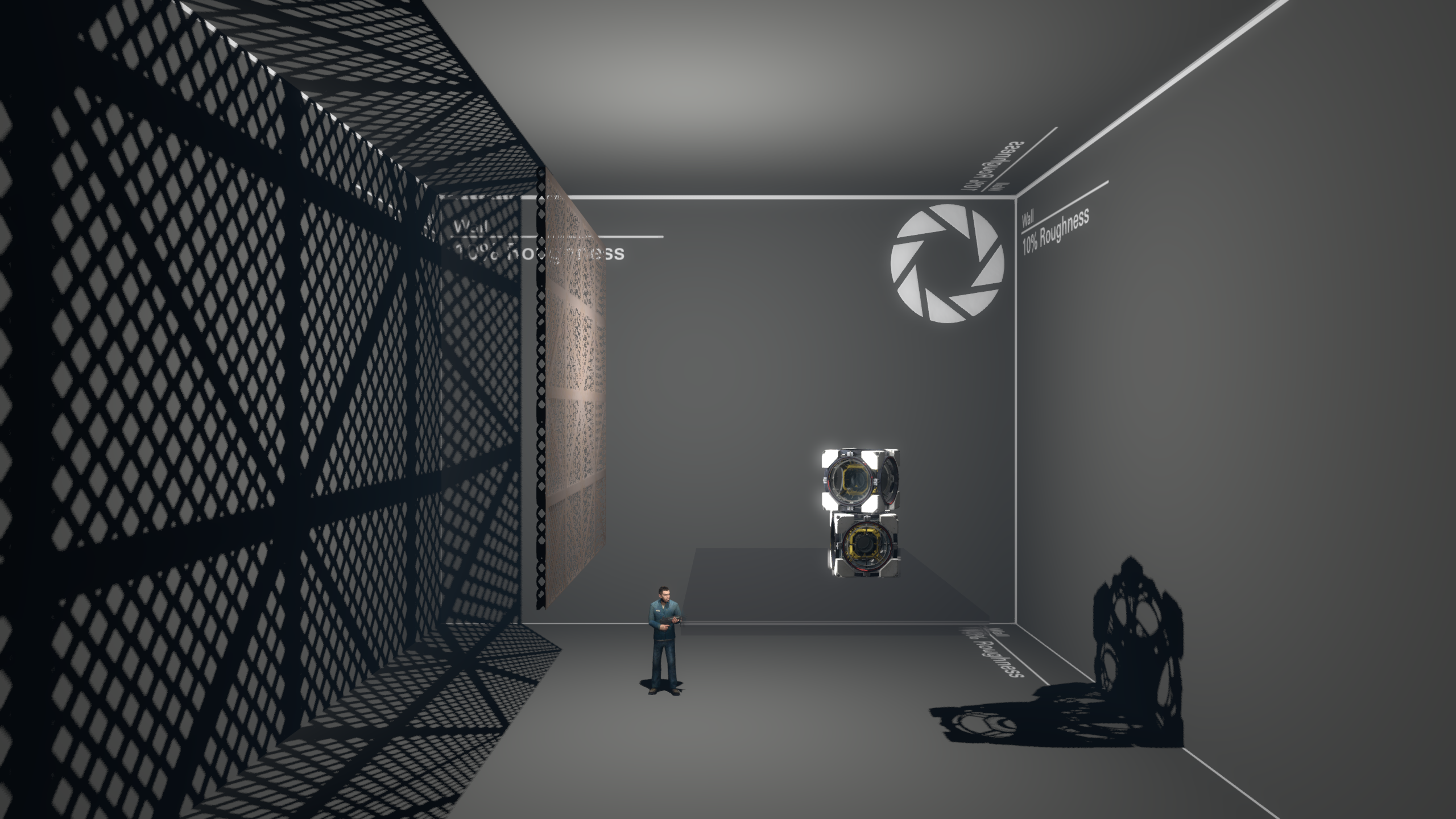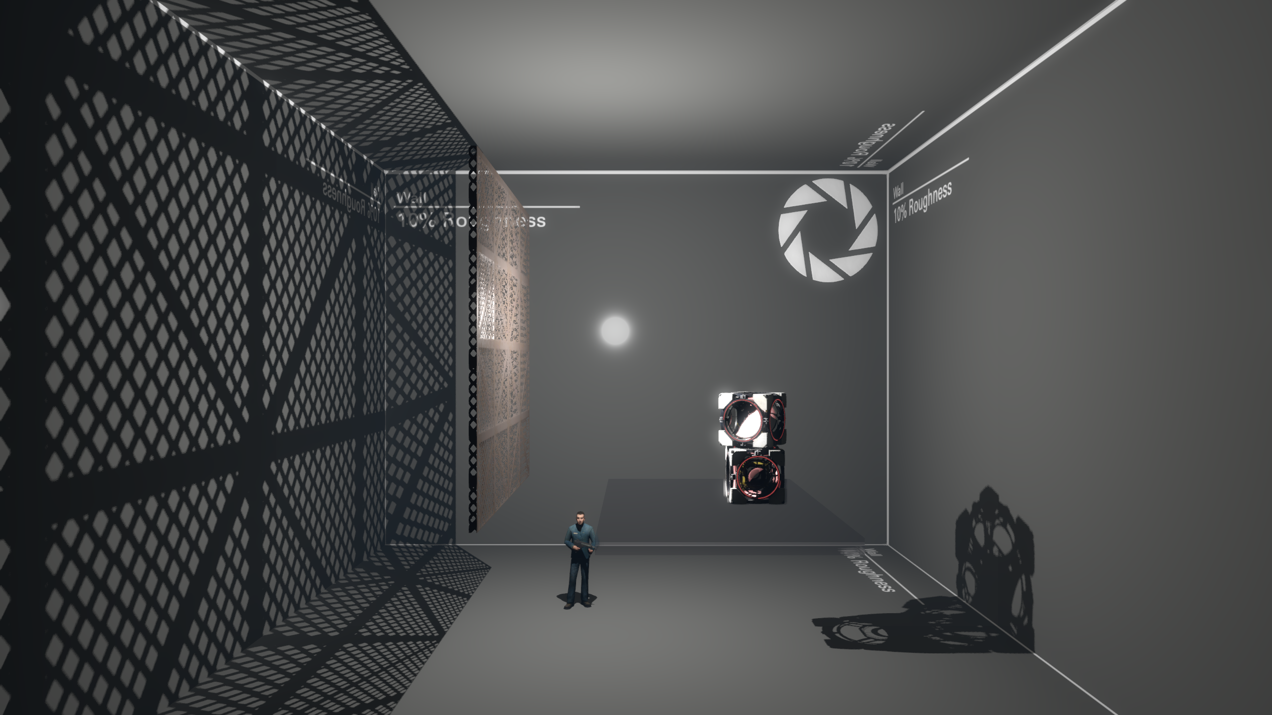 light_rton the top, casting shadows in all 6 directions, and a directionallight_rt_spoton the bottom, casting shadows in one direction.