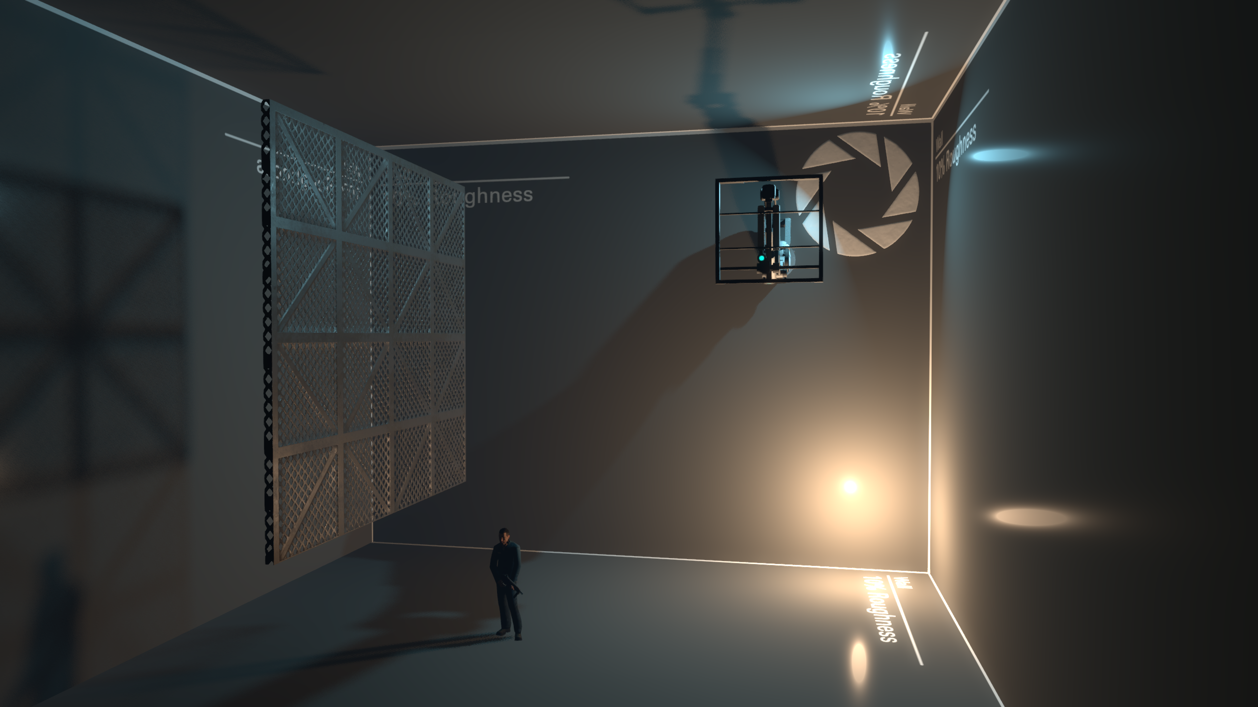 Middle: Specular lighting enabled. Notice a white circle appearing on the wall, as well as reflection on the grate.