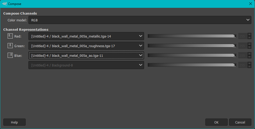 After this, go to "Colors -> Components -> Compose...". Put your Metalness map in the Red channel, your Roughness map in the Green, and your AO map in the Blue. The dropdowns should look like this:
