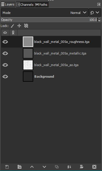 First, go to "Image -> Mode" and make sure "Grayscale" is selected. Even if your images are grayscale, GIMP may still treat them as color images, which prevents this method from working. Then, create a new image with the dimensions of your texture maps. Go to file and click "Import as layers...", select your Metalness, Roughness, and AO maps, and click Import. Your layers should now look similar to this (order is irrelevant):