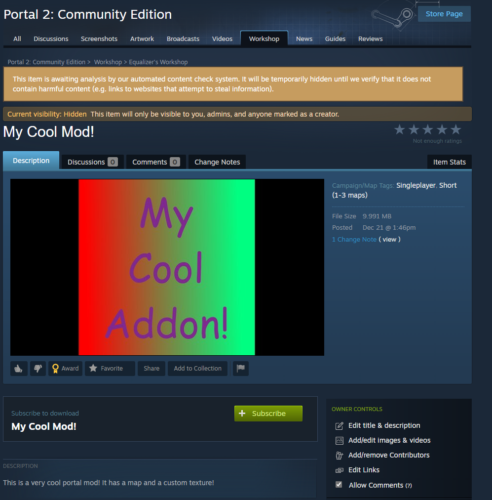 Congratulations! You have now successfully uploaded your addon to the Portal 2: Community Edition workshop!
